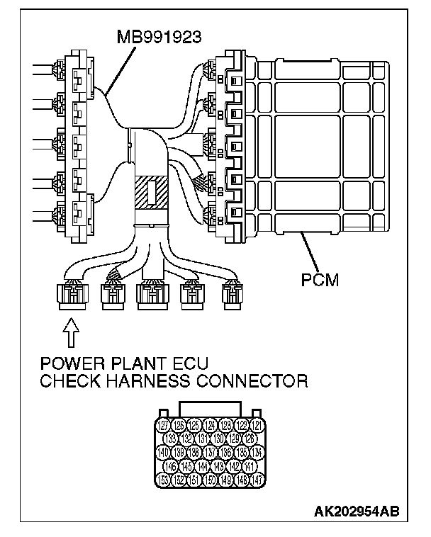 1. Disconnect the all PCM connectors, and connect check harness special tool (MB991923) between the separated connectors.