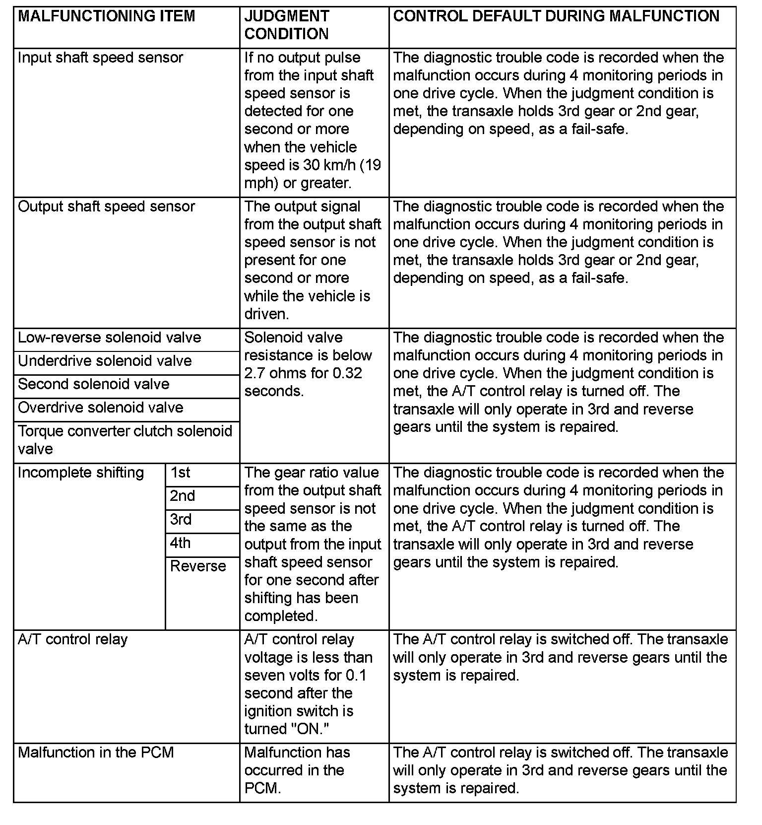 FAIL-SAFE/BACKUP FUNCTIONWhen a malfunction of a main sensor or actuator is detected by the PCM, the transaxle is controlled by preset control logic to maintain safe conditions for driving.