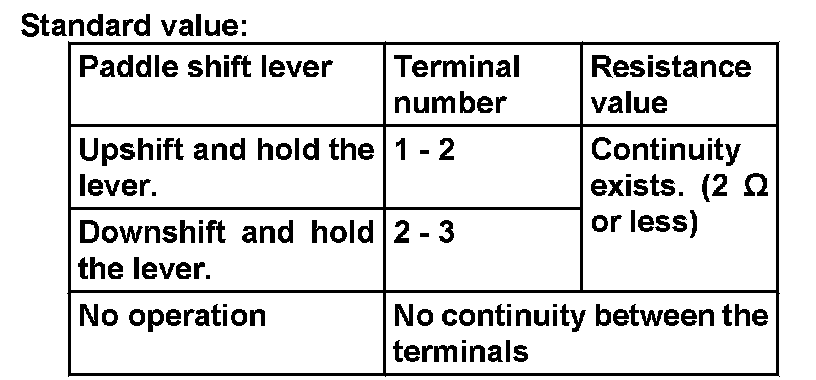 3. Check for continuity between the paddle shift switch connector terminals.