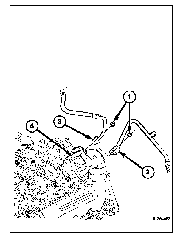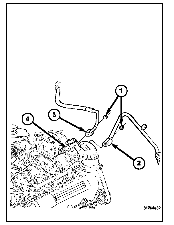 6.Remove the nuts (1) that secure the A/C suction line (2) and A/C discharge line (3) to the A/C compressor (4).