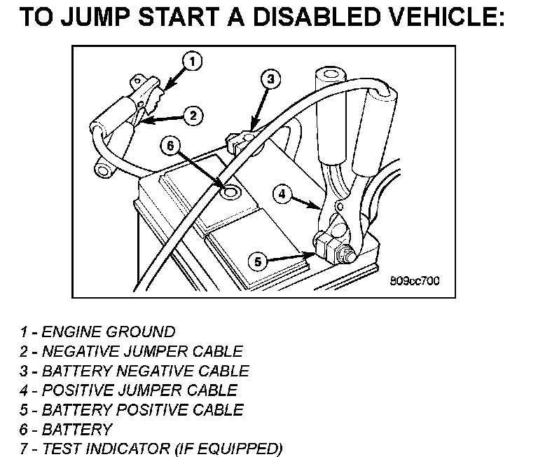 7. Allow battery in disabled vehicle to charge to at least 12.4 volts (75% charge) before attempting to start engine. If engine does not start within 15 seconds, stop cranking engine and allow starter to cool (15 min.), before cranking again.