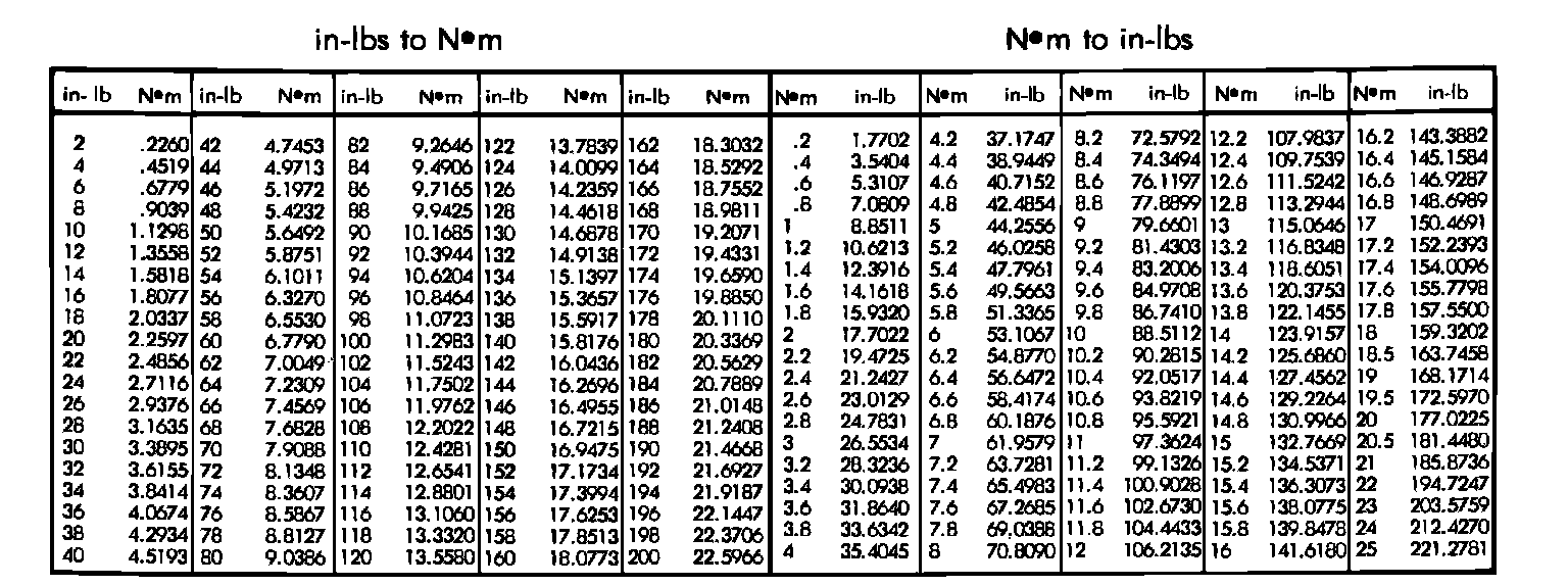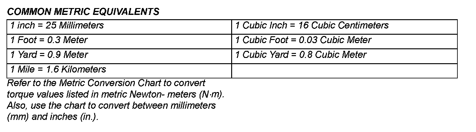 Refer to the Metric Conversion Chart to convert torque values listed in metric Newton- meters (Nm). Also, use the chart to convert between millimeters (mm) and inches (in.).