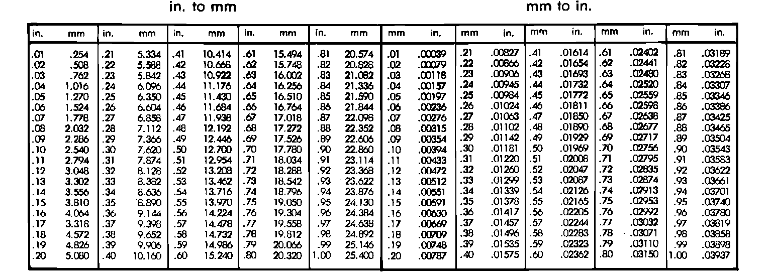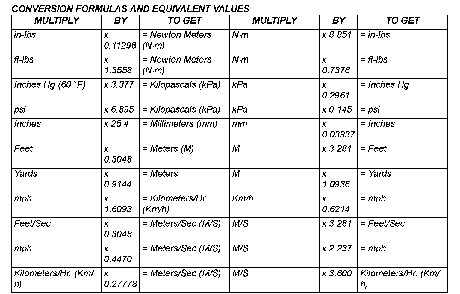 The following chart will assist in converting metric units to equivalent English and SAE units, or vise versa.