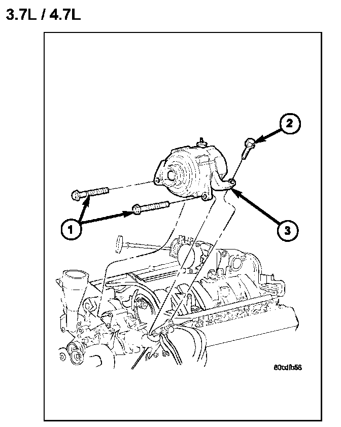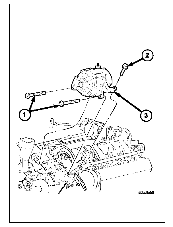 1. Position generator (3) to engine and install 2 horizontal bolts (1) and 1 vertical bolt (2).