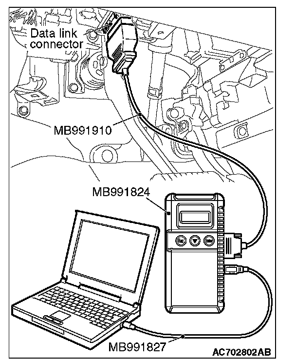 NOTE: Disconnecting scan tool MB991958 is the reverse of the connecting sequence, making sure that the ignition switch is at the "LOCK" (OFF) position.