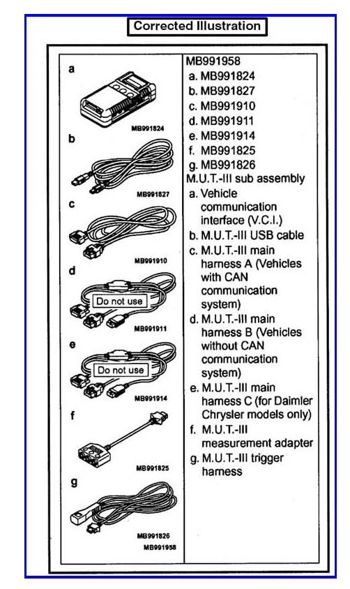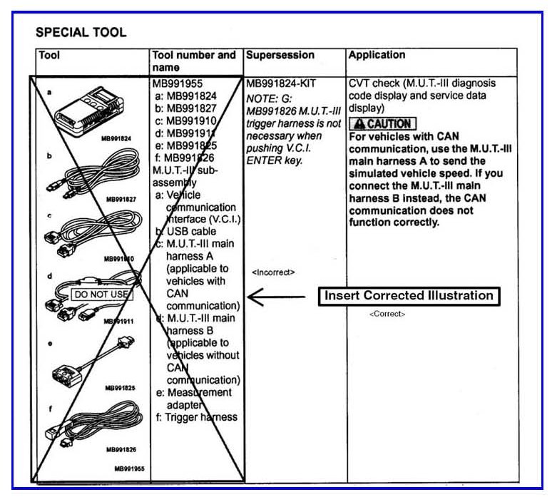 The information for equipment associated with the MUT-III Scan Tool is incorrect in the Service Manual.