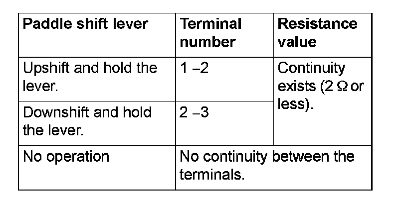 3. Check the continuity between the paddle shift switch connector terminals.