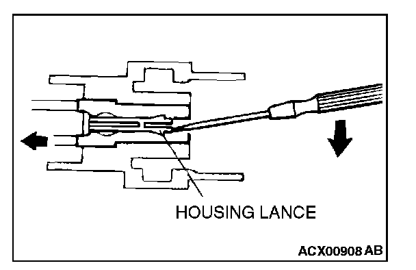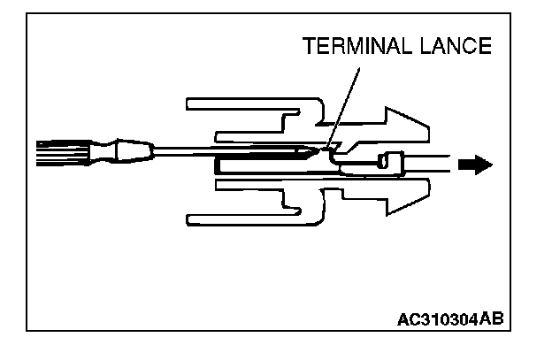 CONNECTOR TERMINAL ENGAGEMENT AND DISENGAGEMENTLoosely engaged terminals can be repaired by removing the female terminal from the connector housing and raising its lance to establish better engagement. Removal of the connector terminal used for MFI and INVECS-II A/T control circuit can be done in the following manner.