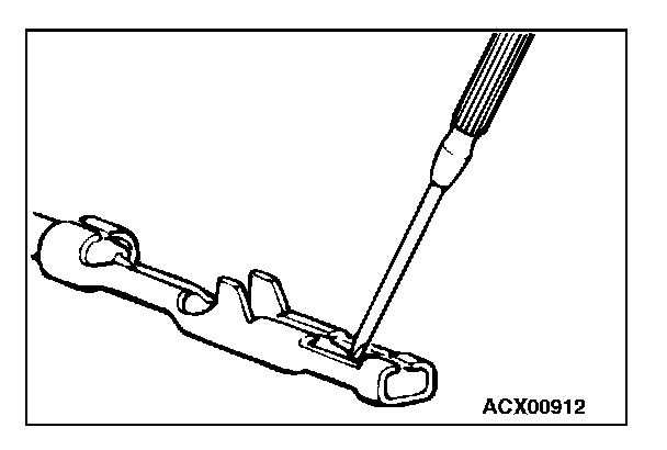 2. Insert the tip of a screwdriver [0.8 mm (0.03 inch) width] into the connector as shown in the figure, push it lightly to raise the housing lance, and pull out the terminal.