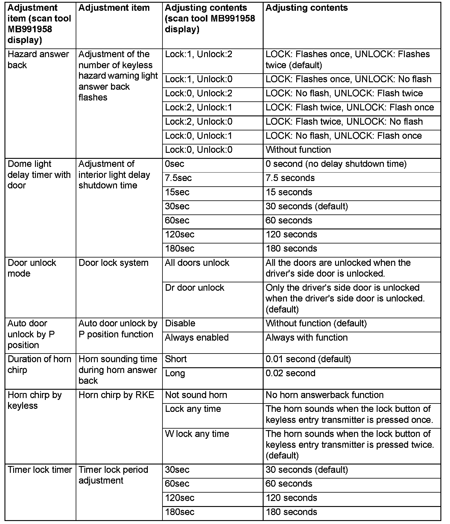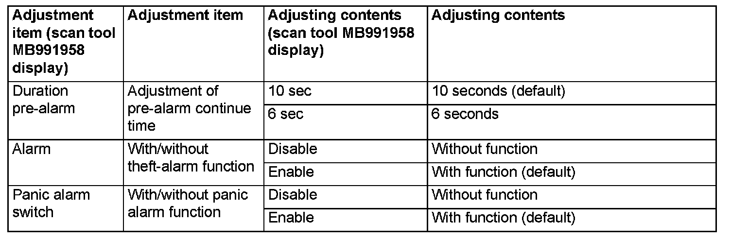 Using the ETACS system of scan tool MB991958, the following functions can be programmed. The programmed information is held even when the battery is disconnected.