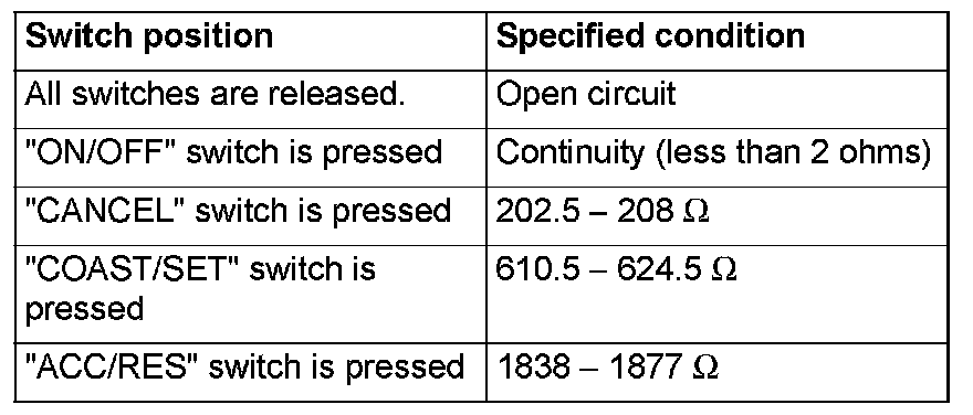2. Measure the resistance between terminal 2 and terminal 3 when each of the "COAST/SET", "ACC/RES", "CANCEL" and "ON/OFF" switches is pressed. If values measured at the time each switch is pressed correspond to those in the table given, the resistance values are correct.