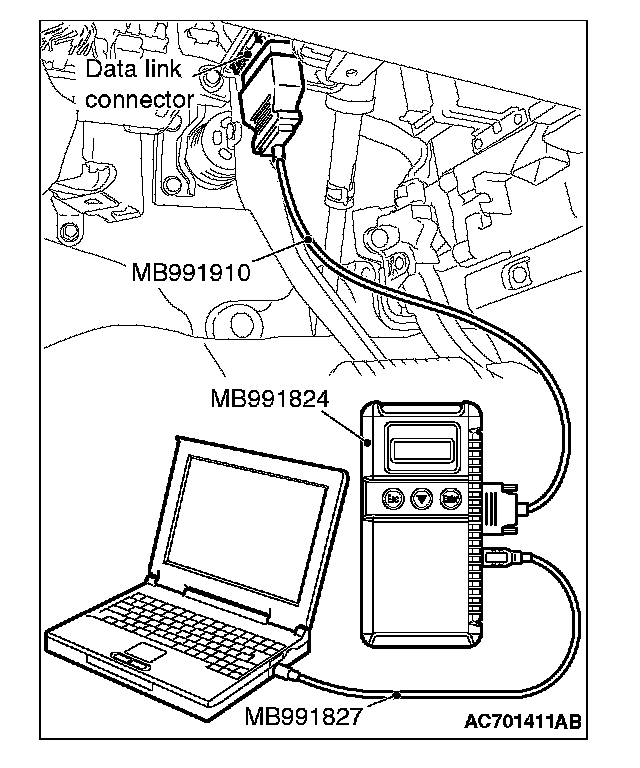 CAUTION: To prevent damage to scan tool MB991958, always turn the ignition switch to the "LOCK" (OFF) position before connecting or disconnecting scan tool MB991958.
