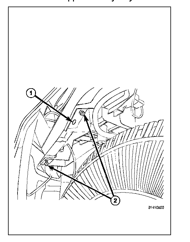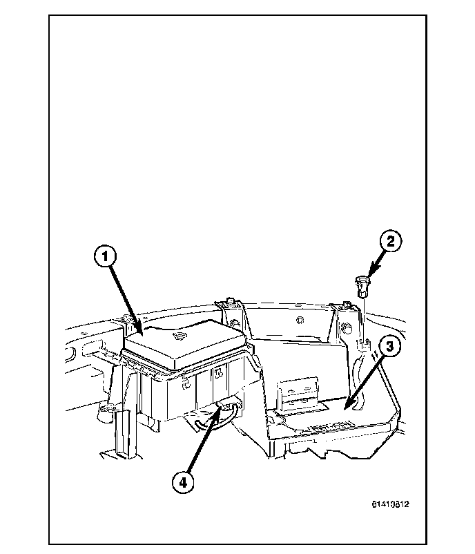 The molded plastic battery tray (3) is located in the left front corner of the engine compartment. On this vehicle, the battery tray also provides an anchor point for the anti-lock brake controller (4) and the Integrated Power Module (IPM) (1). The battery hold down hardware is contained within the battery tray.