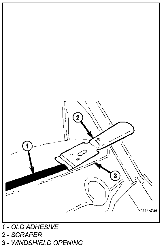 1. Manually remove as much urethane adhesive as possible from around the fence opening. For any remaining urethane that exhibits a cohesive failure at the fence, trim the remaining urethane bead (1) to a 1 to 2 mm thick layer. Bonding of the new urethane will be directly onto this 1 to 2 mm thick layer on the fence.