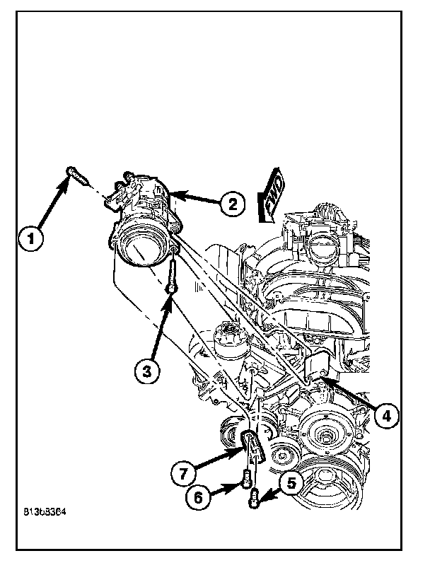 8. Loosen the bolt (5) that secures the bracket (7) to the accessory mounting bracket (4).