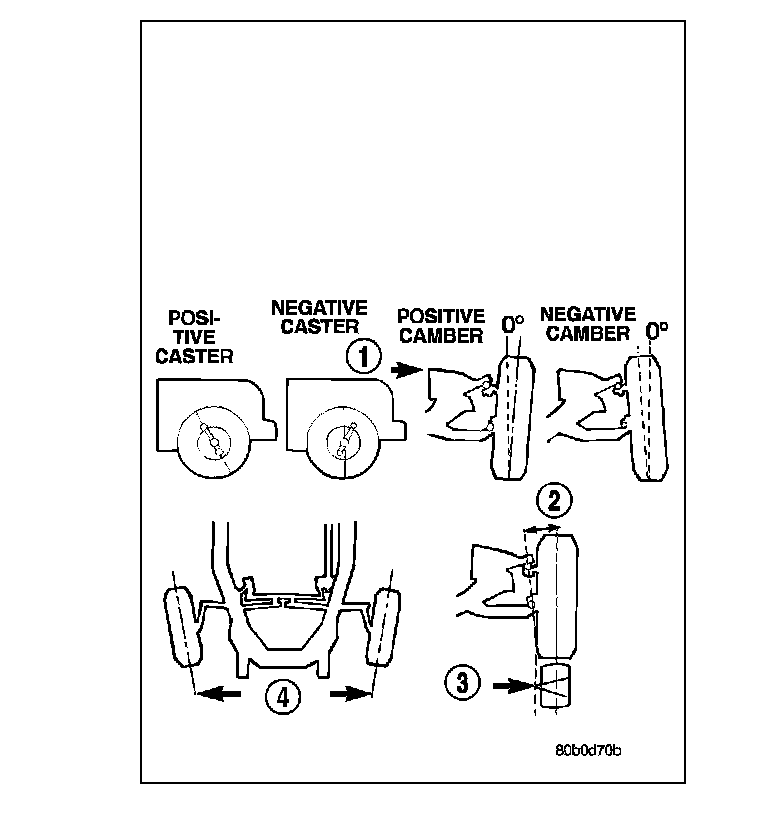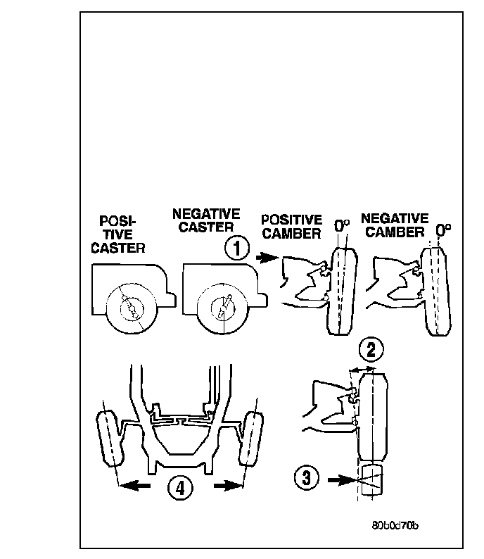 ^ CASTER (1) is the forward or rearward tilt of the steering knuckle from vertical. Tilting the top of the knuckle forward provides less positive caster. Tilting the top of the knuckle rearward provides more positive caster. Positive caster promotes directional stability. This angle enables the front wheels to return to a straight ahead position after turns.