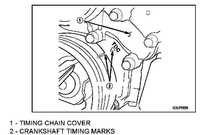 2. Using a mirror, locate the TDC arrow (2) on the front cover (1). Rotate the crankshaft until the mark on the crankshaft damper is aligned with the TDC arrow on the front cover. The engine is now at TDC.