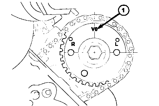 3. Note the location of the V6 mark (1) stamped into the camshaft drive gears. If the V6 mark on each camshaft drive gear is at the twelve o'clock position, the engine is at TDC on the exhaust stroke. If the V6 mark on each gear is at the six o'clock position, the engine is at TDC on the compression stroke.