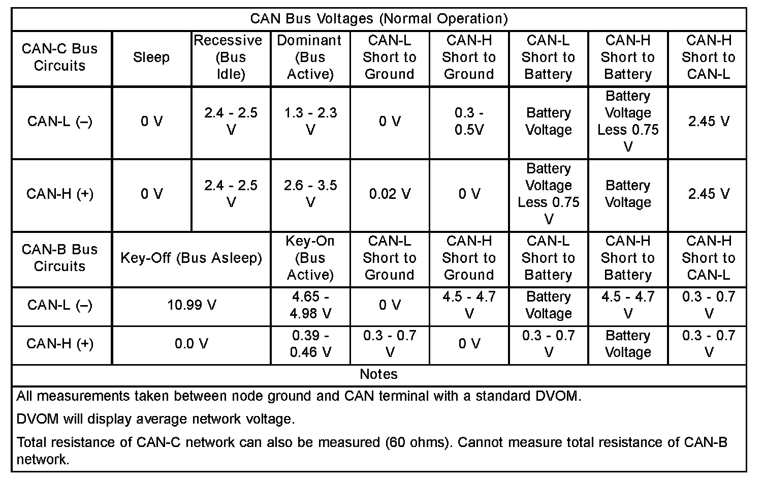 Note: Termination resistance of a CAN-B node cannot be verified with a Digital Multi-Meter (DMM) or Digital Volt-Ohm Meter (DVOM). The transceiver of each CAN-B node connects to termination resistors internally. When the vehicle battery is disconnected, the internal connections of all CAN-B transceivers are switched open, disconnecting the termination resistors. Therefore, the total bus resistance measured under these condition will be extremely high or infinite, which does not accurately reflect the actual termination resistance of the CAN-B bus.