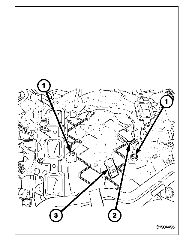 The two knock sensors (1) are bolted into the cylinder block under the intake manifold (3).