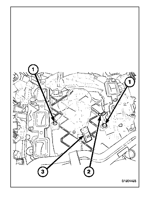 The two knock sensors (1) are bolted into the cylinder block under the intake manifold. The two sensors share a common wiring harness using one electrical connector (3). Because of this, they must be replaced as a pair.