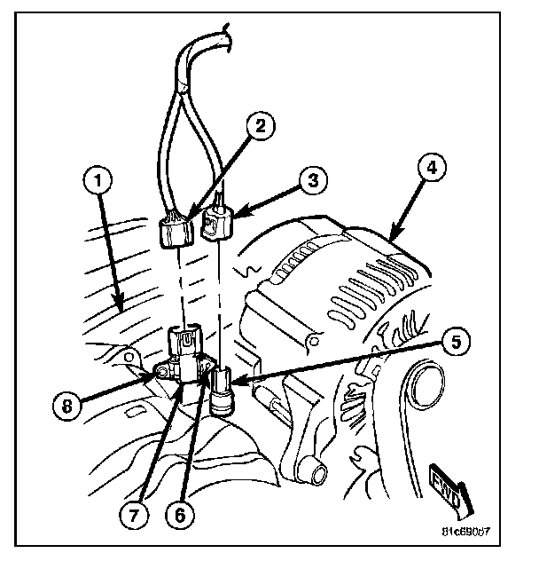MAP SENSOR - REMOVAL - 3.7LThe Manifold Absolute Pressure (MAP) sensor (7) is mounted into the front of the intake manifold (1).