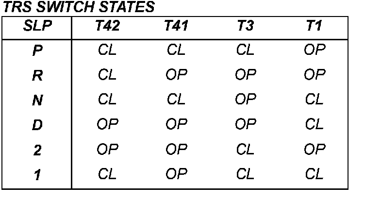 The Transmission Range Sensor (TRS) communicates shift lever position (SLP) to the TCM as a combination of open and closed switches. Each shift lever position has an assigned combination of switch states (open/closed) that the TCM receives from four sense circuits. The TCM interprets this information and determines the appropriate transmission gear position and shift schedule.