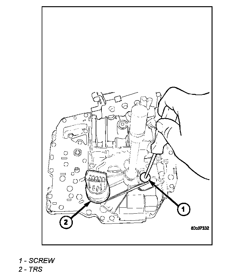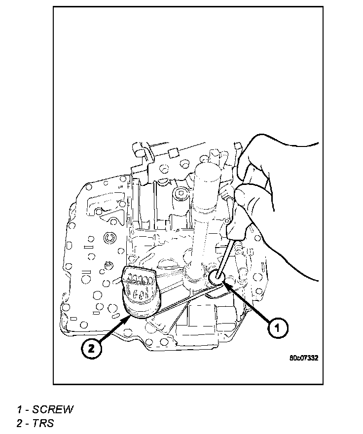 1. Install the TRS (2) to the manual shaft. Make sure TRS locating pin rests in manual valve bore slot.
