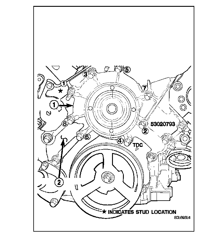 Using a new gasket, position water pump (1) and install mounting bolts as shown. Tighten water pump mounting bolts to 58 Nm (43 ft. lbs.) torque.