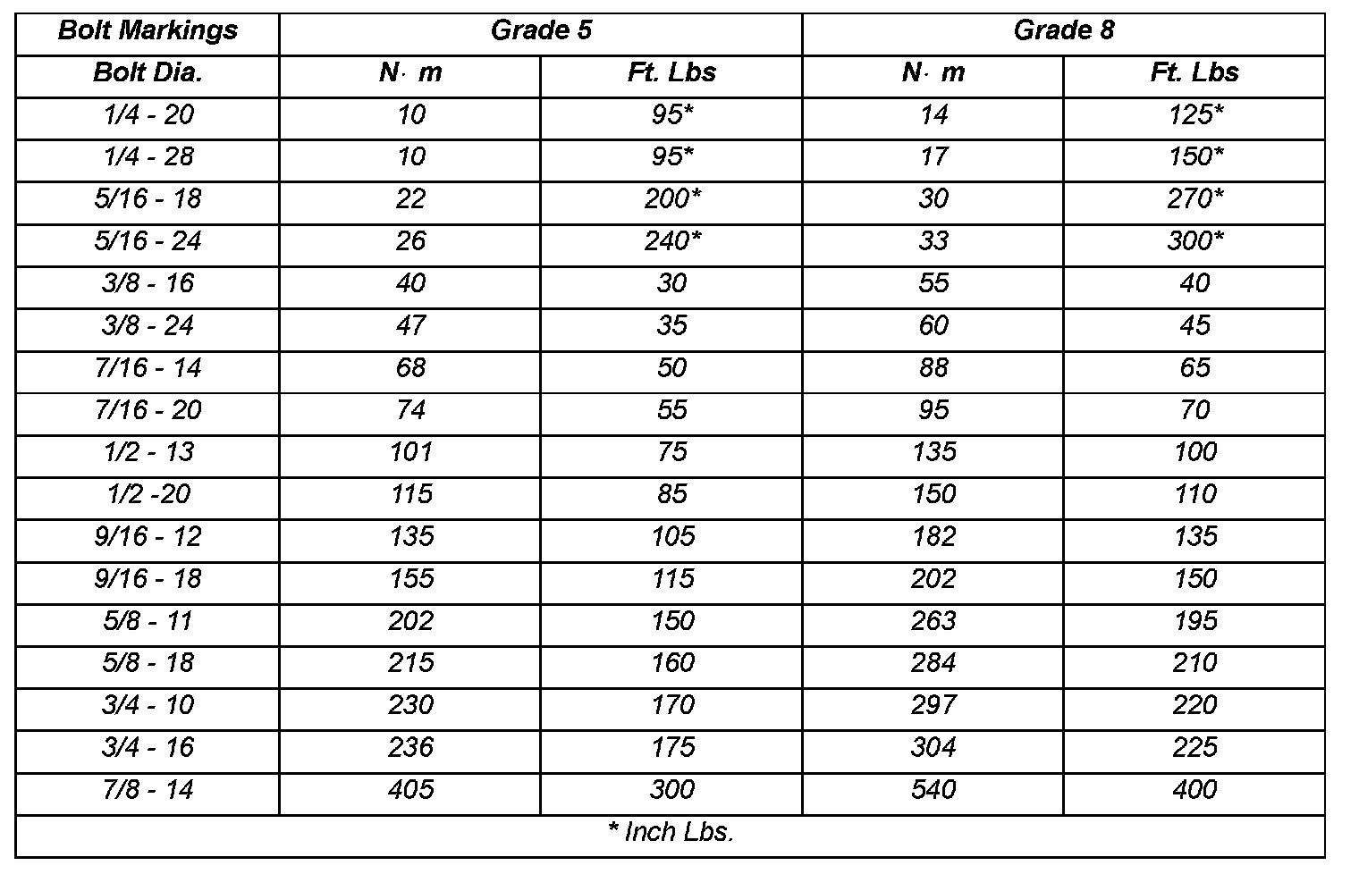 FASTENER IDENTIFICATIONThe SAE bolt strength grades range from grade 2 to grade 8. The higher the grade number, the greater the bolt strength. Identification is determined by the line marks on the top of each bolt head. The actual bolt strength grade corresponds to the number of line marks plus 2. The most commonly used metric bolt strength classes are 9.8 and 10.9. The metric strength class identification number is imprinted on the head of the bolt. The higher the class number, the greater the bolt strength. Some metric nuts are imprinted with a single-digit strength class on the nut face. Refer to the Fastener Identification and Fastener Strength Charts.
