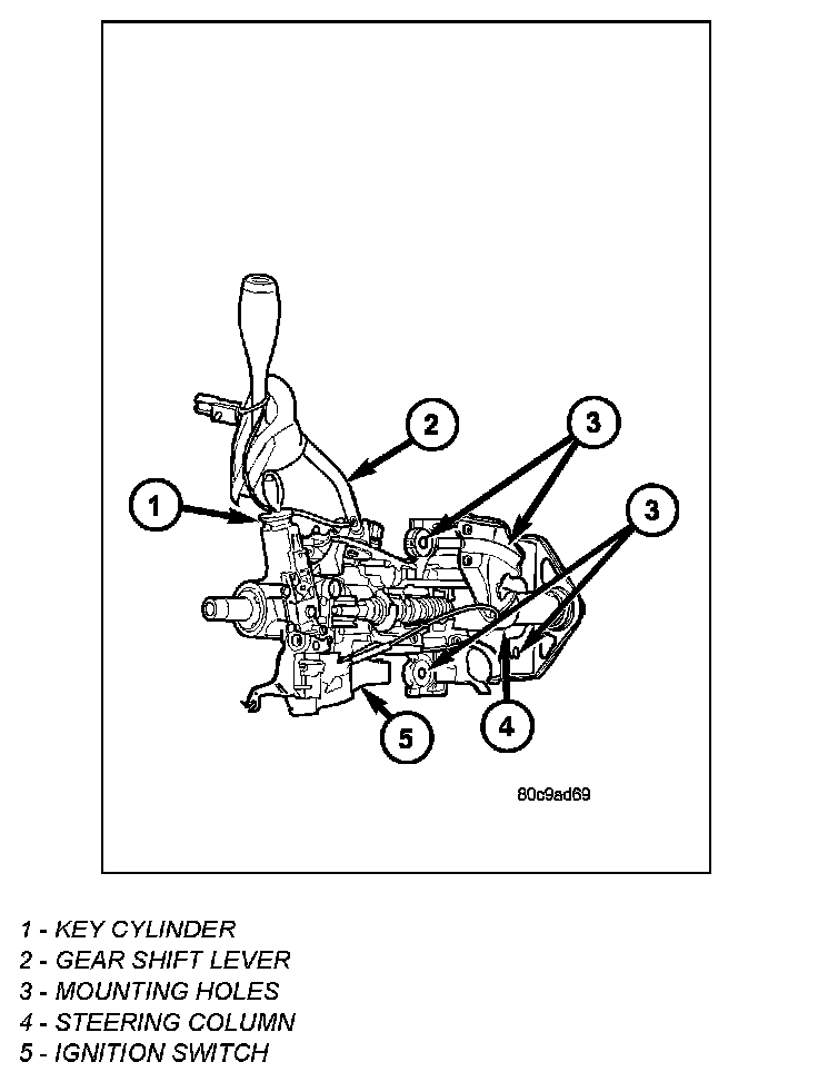 The ignition switch (5) is located on the steering column (4). It is used as the main on/off switching device for most electrical components. The mechanical key cylinder is used to engage/disengage the electrical ignition switch.