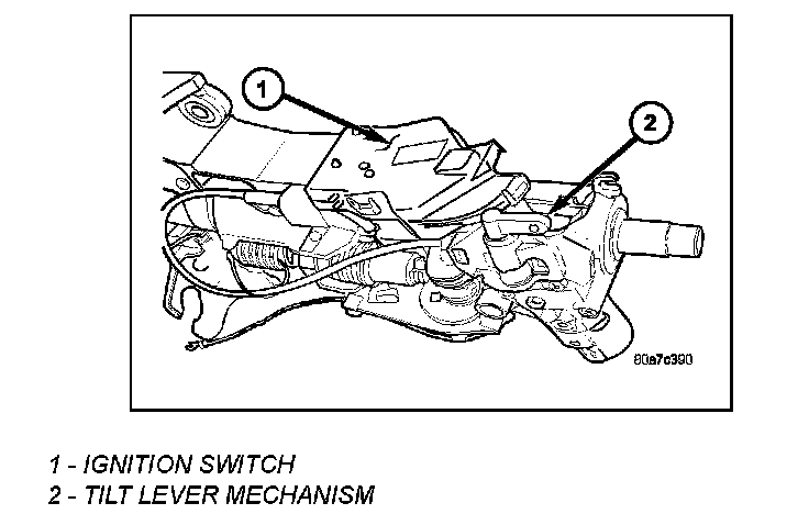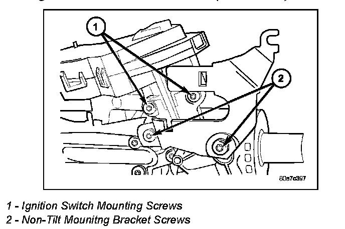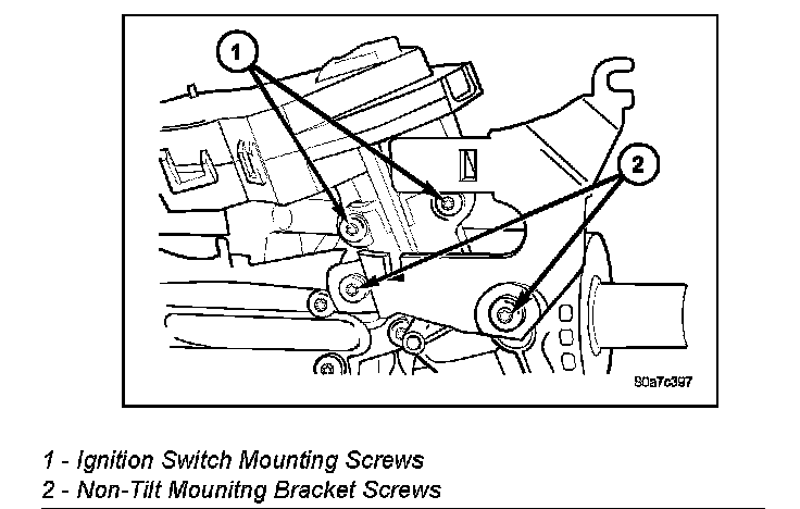 8. For columns without tilt remove the bracket (2) to gain access to the ignition switch mounting screws (1).