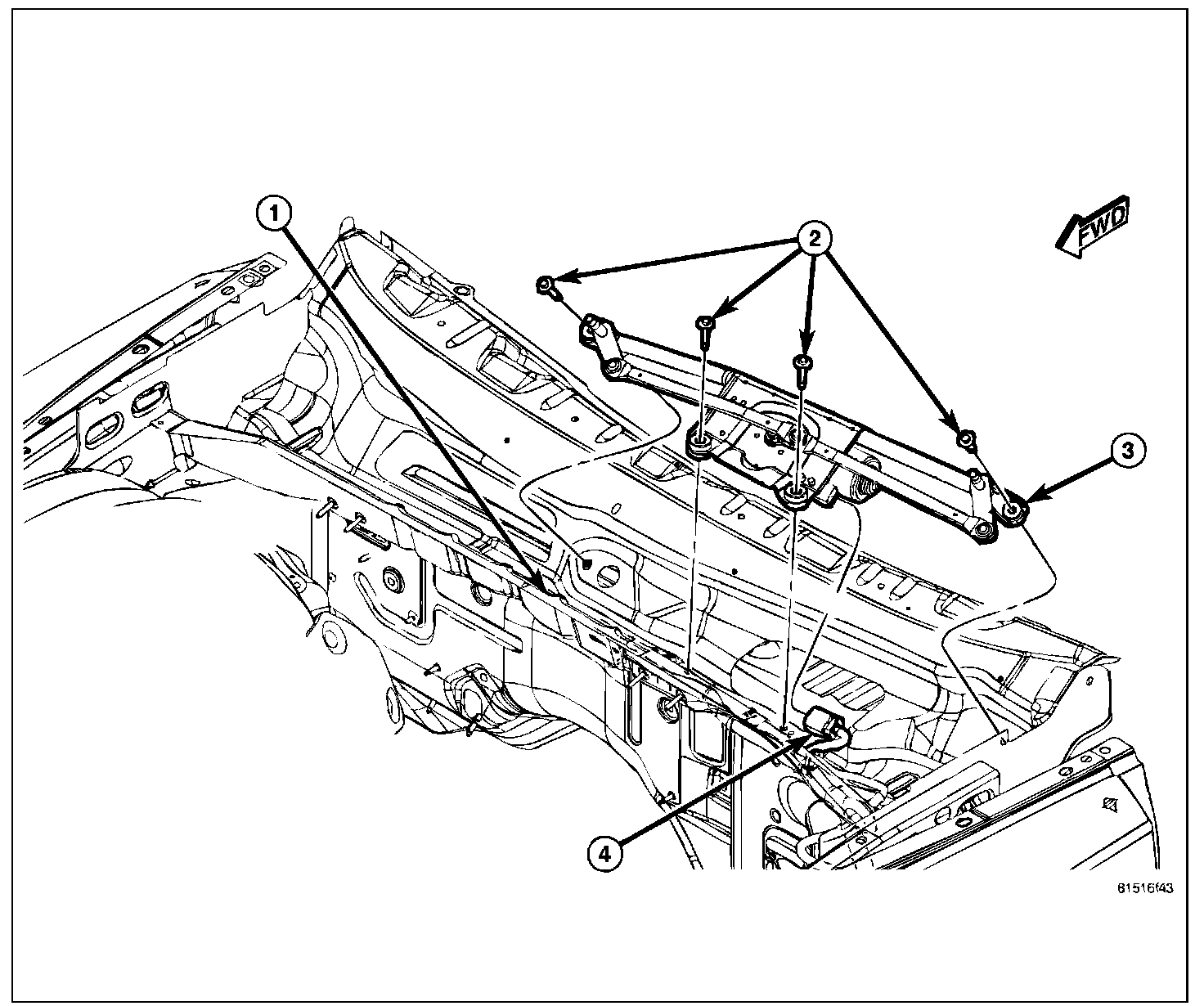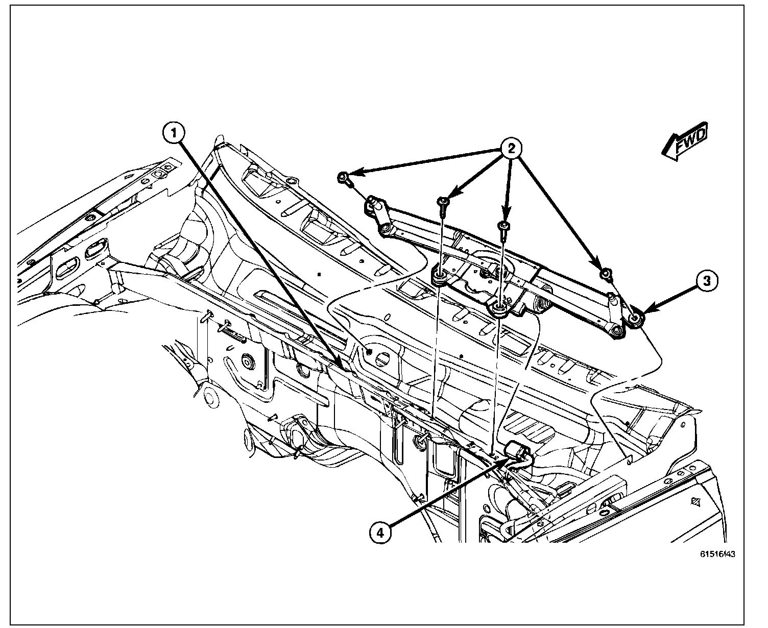 5. Remove the four screws (2) that secure the wiper module (3) to the cowl plenum panel.