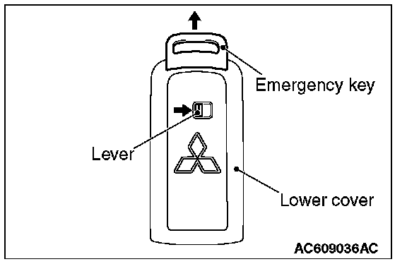 Move the lever on the lower cover to the direction shown by the arrow to remove the emergency key from the keyless operation key.