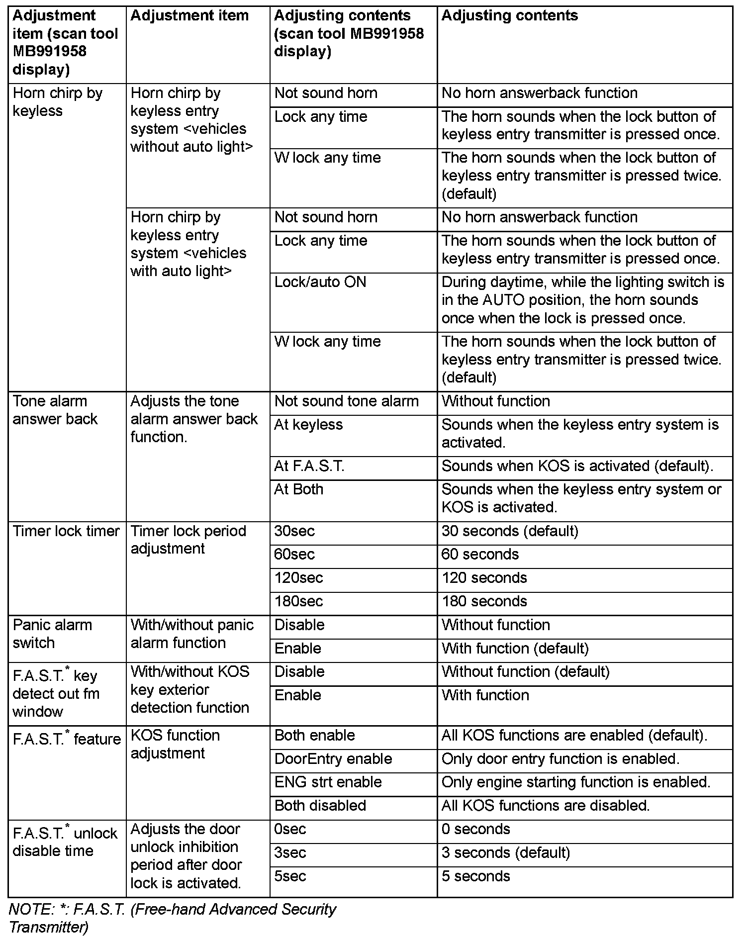 Using the ETACS system of scan tool MB991958, the following functions can be programmed. The programmed information is held even when the battery is disconnected.