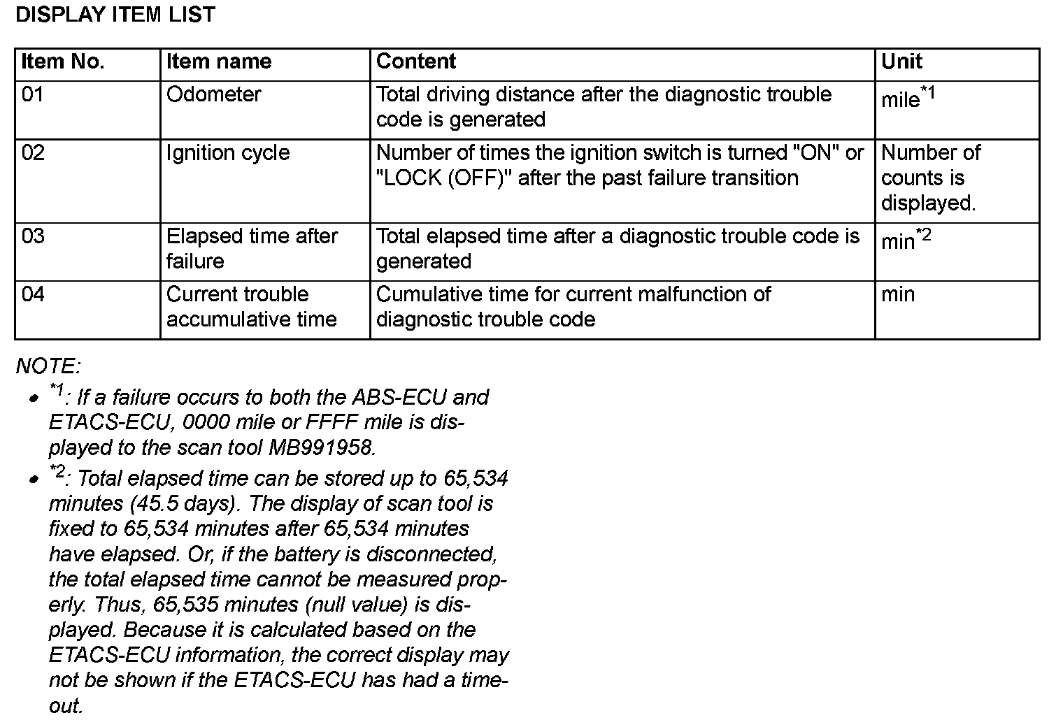 When detecting fault and storing the DTC, the ECU connected to CAN bus line obtains the data before the determination of the DTC and the data when the DTC is determined, and then stores the ECU status of that time. By analyzing the data from scan tool, the troubleshooting can be performed more efficiently. The displayed items are as shown in the table below.
