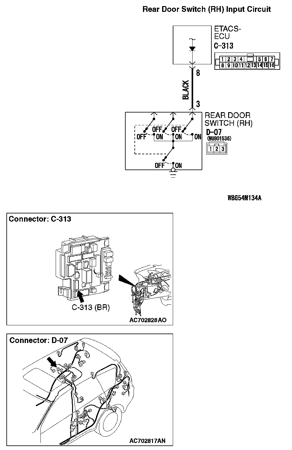 INSPECTION PROCEDURE 8: ETACS-ECU does not receive any signal from the rear door switch (RH).Rear Door Switch (RH) Input Circuit: