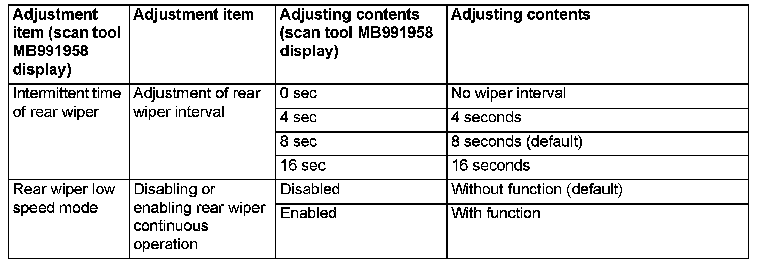 Using the ETACS system of scan tool MB991958, the following functions can be programmed. The programmed information is held even when the battery is disconnected.