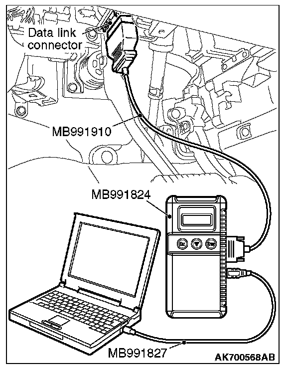 CAUTION: To prevent damage to scan tool MB991958, always turn the ignition switch to the "LOCK" (OFF) position before connecting or disconnecting scan tool MB991958.