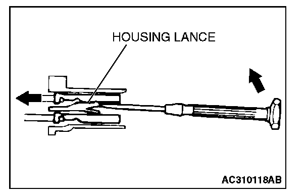 2. Insert the tip of the screwdriver [1.4 mm (0.06 inch) or 2.0 mm (0.08 inch) width] into the connector as shown in the figure, raise the housing lance slightly with the tip, and pull out the terminal.