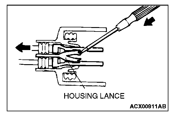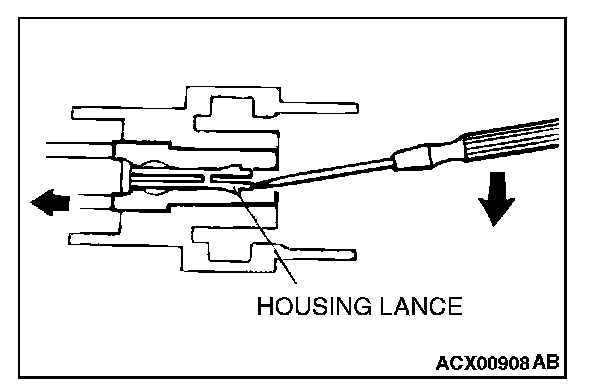 2. Insert the tip of a screwdriver [0.8 mm (0.03 inch) width] into the connector as shown in the figure, push it lightly to raise the housing lance, and pull out the terminal.