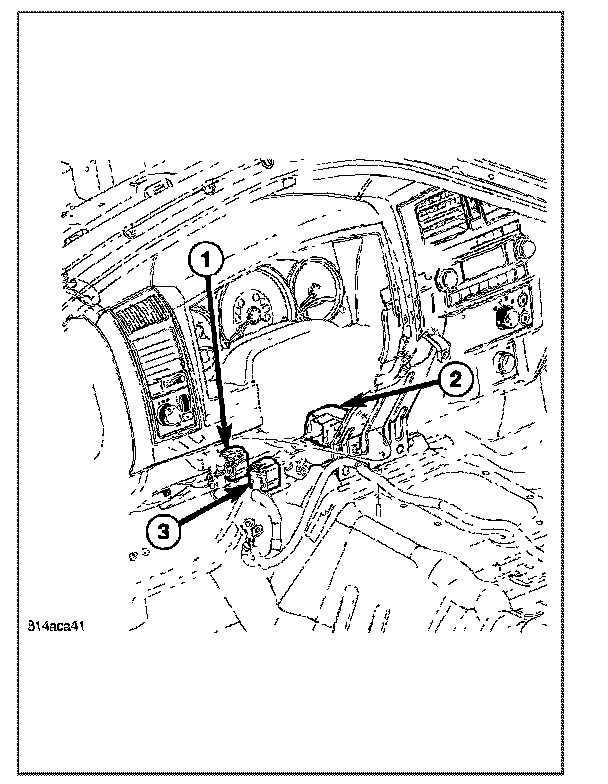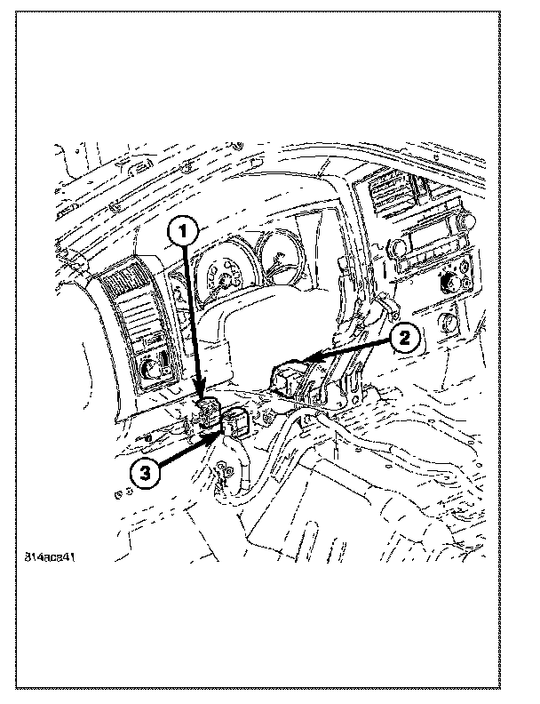 3. Disconnect the instrument panel (1) (C1) and body (3) (C2) wire harness connectors from the Occupant Restraint Controller (ORC) (2) connector receptacles located on the left facing side of the module. To disconnect the connectors from the ORC:
