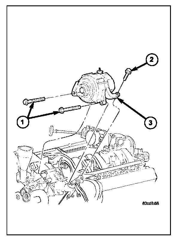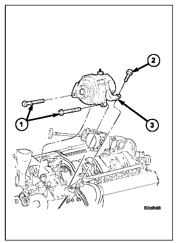 1. Position generator (3) to engine and install 2 horizontal bolts (1) and 1 vertical bolt (2).
