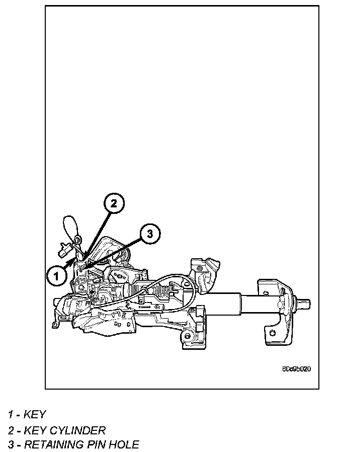 (2) Press in on retaining pin while pulling key cylinder (1) from ignition switch.