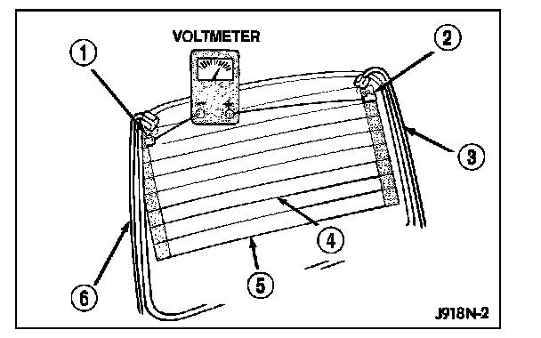 4. If broken defogger grid lines or bus bars are suspected, use a 12-volt DC voltmeter and contact terminal A with the negative lead and each rear glass heating grid line at its mid-point C (4) with the positive lead. The voltmeter should read approximately 6 volts at each grid line midpoint. If the voltmeter does not read approximately 6 volts, repair the open grid line(s) or bus bar(s).