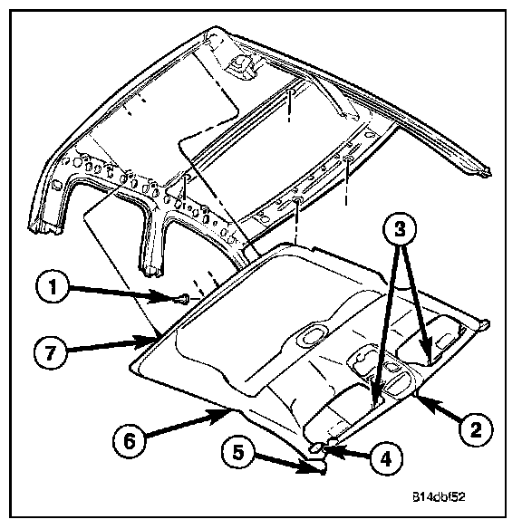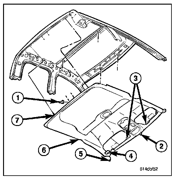 15. Install the headliner (6) (Refer to - INTERIOR/HEADLINER/INSTALLATION).