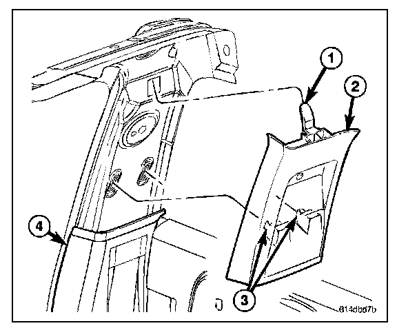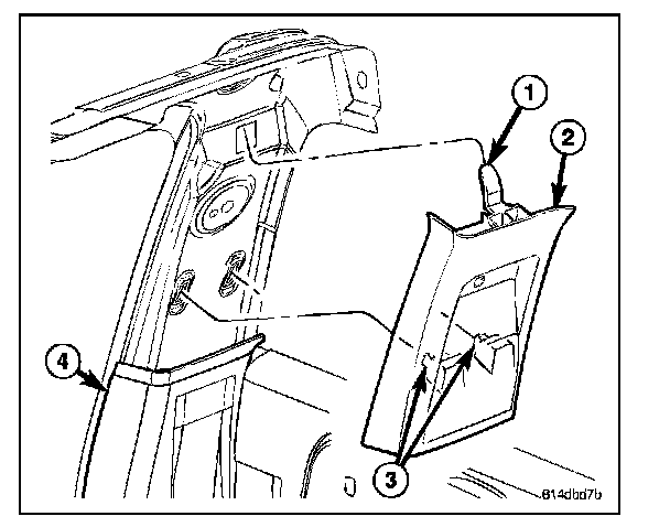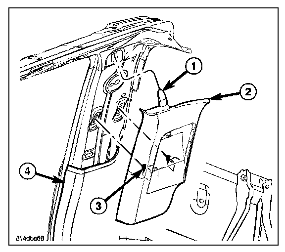 3. On extended cab models remove the upper c-pillar trim (2). (Refer to - INTERIOR/PANEL - C PILLAR UPPER TRIM/REMOVAL)