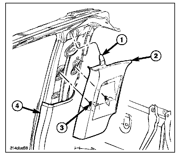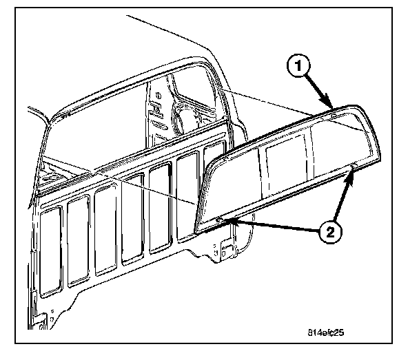 13. On extended cab models, install the upper c-pillar trim (2) (Refer to - INTERIOR/PANEL - C PILLAR UPPER TRIM/INSTALLATION)