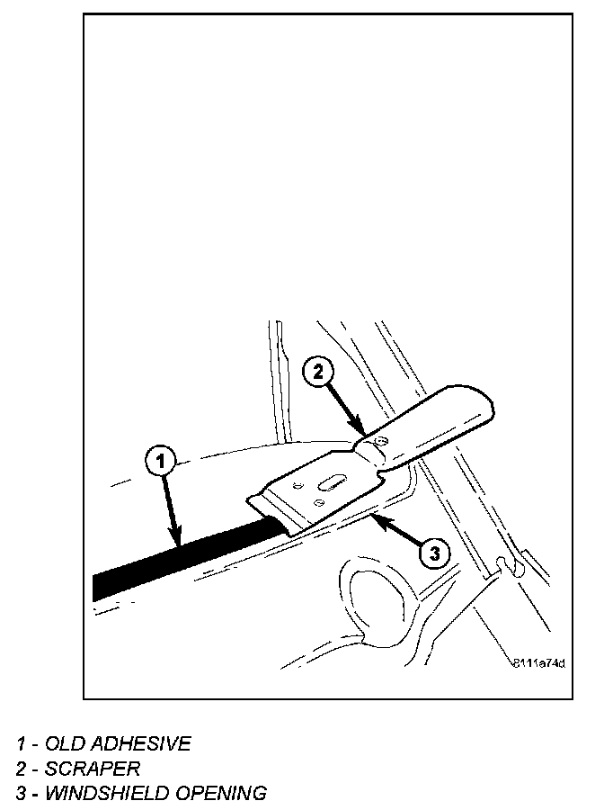 1. Manually remove as much urethane adhesive as possible from around the fence opening. For any remaining urethane that exhibits a cohesive failure at the fence, trim the remaining urethane bead (1) to a 1 to 2 mm thick layer. Bonding of the new urethane will be directly onto this 1 to 2 mm thick layer on the fence.