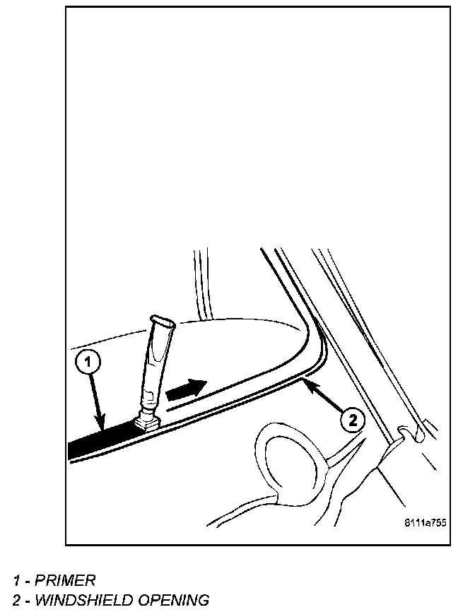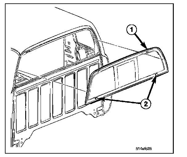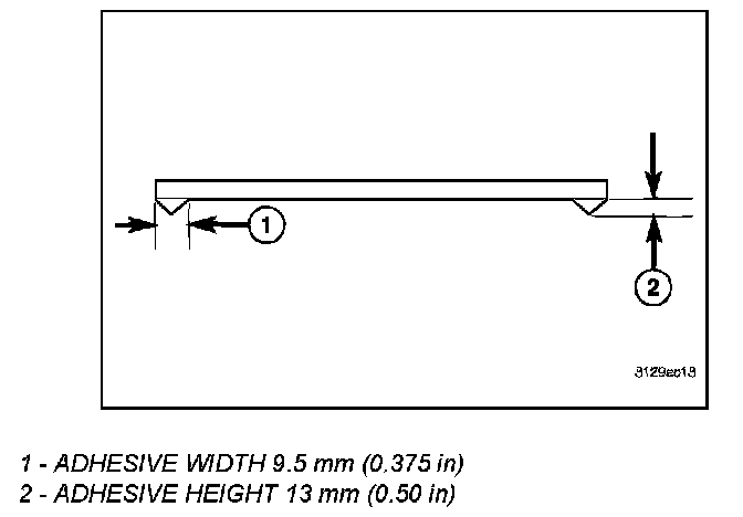 5. Apply a 13 mm (0.5 in.) (2) X 9.5 mm (0.375 in) (1) bead of urethane around the perimeter of the window frame bonding surface.